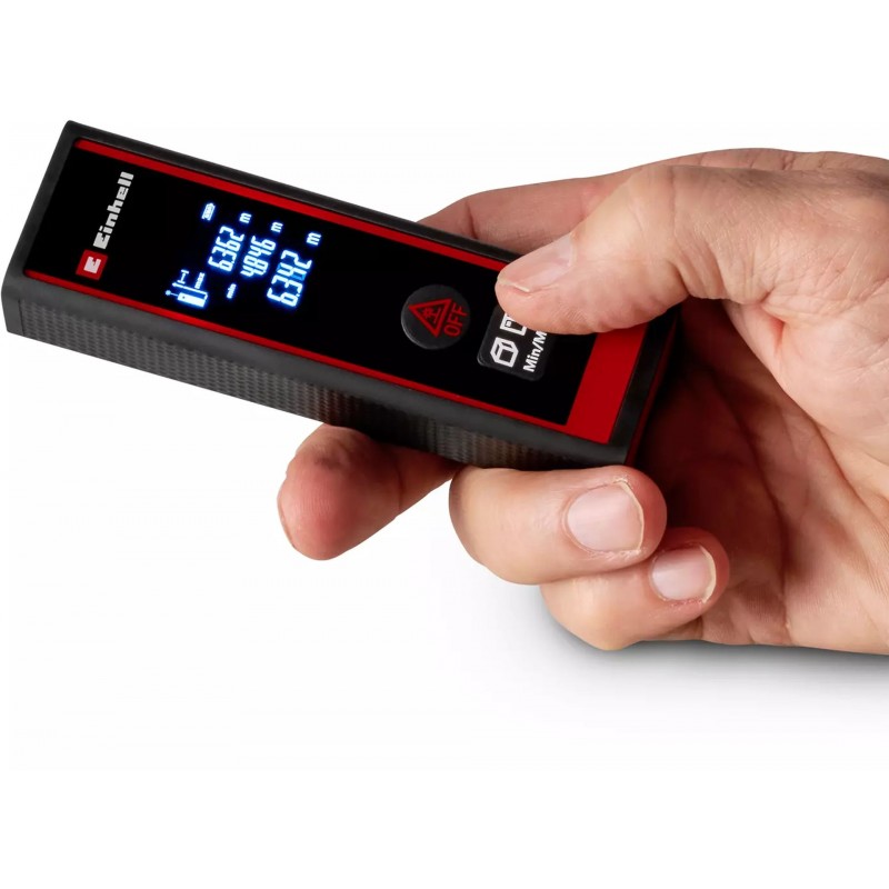 Laserové měřidlo Einhell TC-LD 40 R je přesný a univerzální měřicí přístroj pro použití v domácnosti, na zahradě nebo na stavbě. Díky měřicímu rozsahu 0,05 až 40 m a laseru třídy II (vlnová délka 635 nm) poskytuje přesné výsledky. Přesnost +/- 3 mm zajišťuje maximální přesnost při měření vzdáleností, ploch a při výpočtu objemů. Měření lze provádět z přední nebo spodní části přístroje. Kromě jednotlivých měření je k dispozici funkce průběžného měření pro nepřetržité určování vzdáleností. Intuitivní ovládání podporuje podsvícený LCD displej s jasně zobrazenými výsledky měření. Laser lze aktivovat samostatně a automatické vypnutí po 1 minutě nečinnosti prodlužuje životnost baterií. Tělo s soft grip povrchy zajišťuje bezpečné a pohodlné držení. Součástí je praktické ochranné pouzdro. Pro provoz jsou potřeba 2× 1,5 V AAA baterie (nejsou součástí balení).