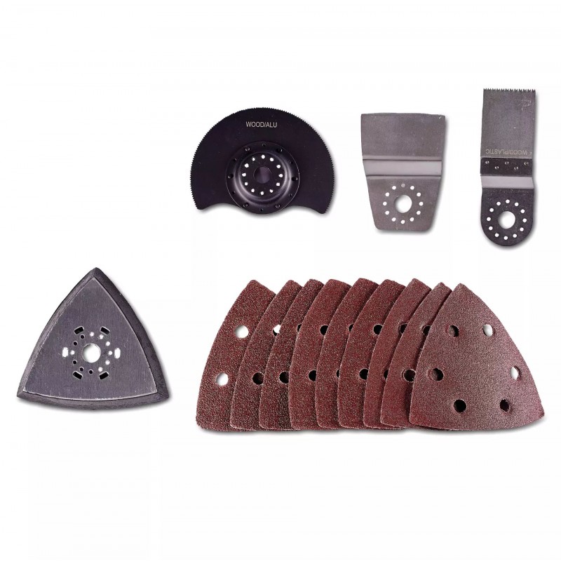 Vč. trojúhelníkové brusné desky, 9 ks brusného papíru, škrabky, ponorného pilového listu a segmentového pilového listu na dřevo, plast a měkký kov