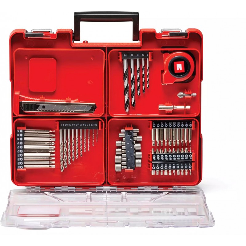 Dodávka obsahuje dva 2,0 Ah akumulátory Power X-Change a rychlonabíječku – práce tak může začít okamžitě. Součástí dodávky je také 69dílná sada příslušenství z různých bitů, vrtáků, řezacího nože a metru. Aku vrtačku lze spolu s akumulátory, nabíječkou a sadou příslušenství uložit do praktického přepravního a úložného kufru a ušetřit tak místo.