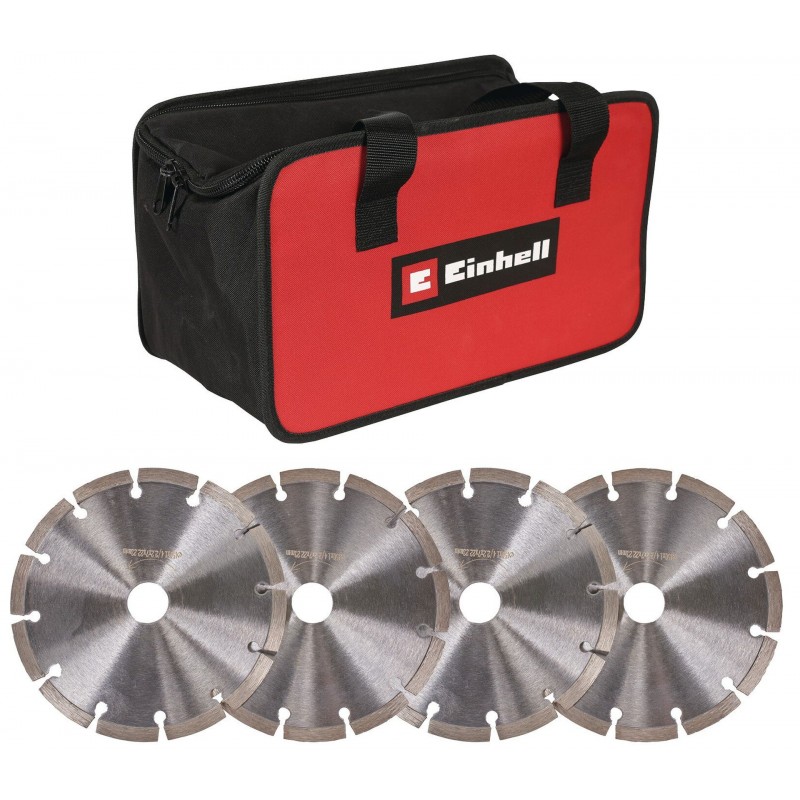 Aby bylo možné začít ihned pracovat, je drážkovací fréza Einhell TE-MA 1700 dodávána s příslušenstvím. Součástí jsou čtyři vysoce kvalitní diamantové řezné kotouče o průměru 150 mm a také klíč pro snadnou výměnu frézy. Součástí balení je také taška pro uložení frézy s příslušenstvím, která umožňuje její snadné přenášení.