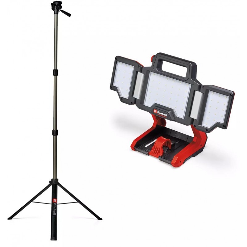 Kromě lampy obsahuje sada vysoce kvalitní teleskopický stojan z robustního hliníku. Díky integrovanému závitu 5/8" je kompatibilní s širokou škálou svítidel, jako je lampa Einhell Aku P-CL 18/3000 Li. Teleskopický stojan je možné prodloužit z 85 cm na 170 cm. Protiskluzové polohování je zajištěno vysoce kvalitními plastovými krytkami.
