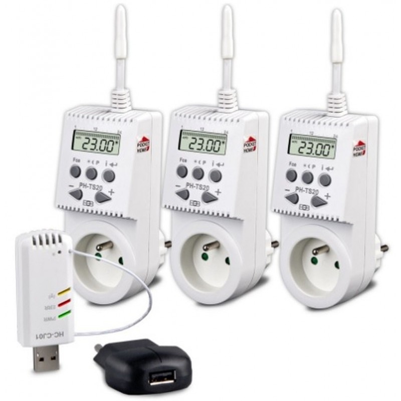 Set systému Home Control se třemi tepelně spínanými zásuvkami slouží pro elektrické topné soustavy. Umožňuje nastavit teplotu v celém domě nebo v jednotlivých místnostech, zjištění aktuálních teplot i automatickou regulaci podle předem nastavených programů.