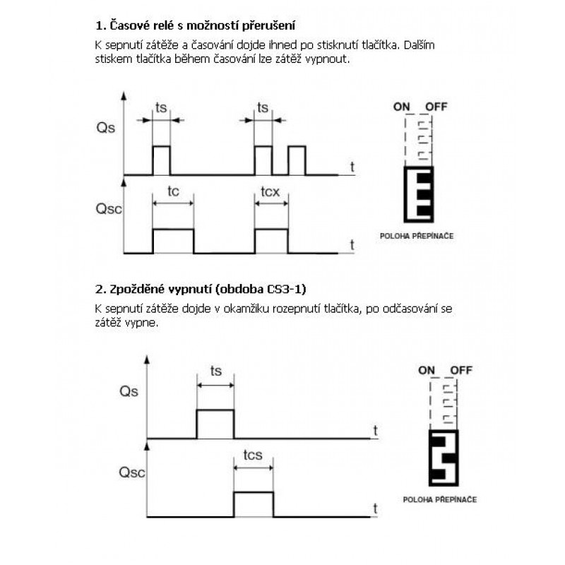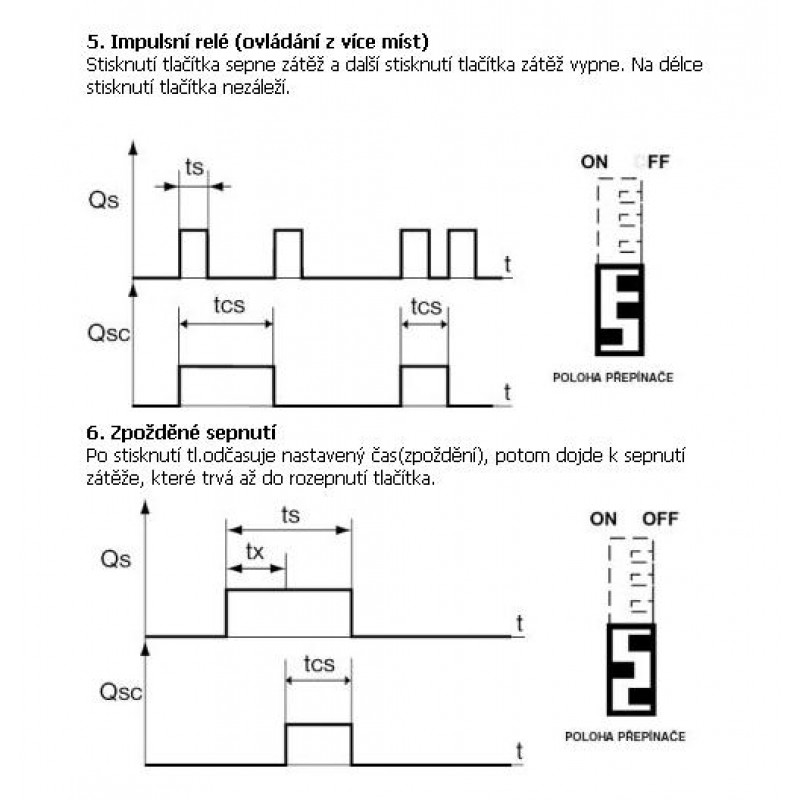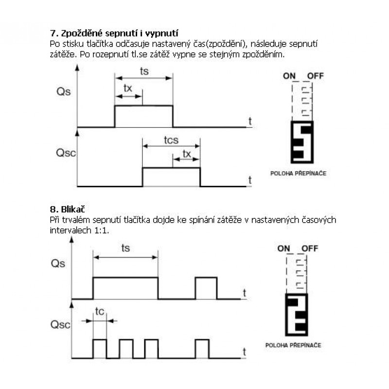 K sepnutí zátěže dojde v okamžiku rozepnutí tlačítka, po odčasování se zátěž vypne.