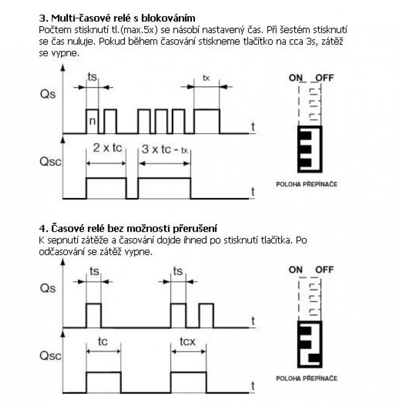 Počtem stisknutí tl.(max.5x) se násobí nastavený čas. Při šestém stisknutí se čas nuluje. Pokud během časování stiskneme tlačítko na cca 3s, zátěž se vypne.
