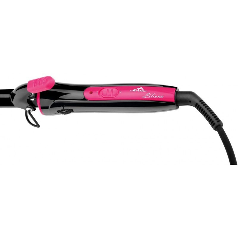 Kulma ETA Liliana 1328 90000, v atraktivním černo-růžovém provedení, je praktický pomocník pro vytvarování vašeho účesu. Její průměr je 19 mm, vládne příkonem 25 W, PTC topná tělesa zaručují velmi rychlé dosažení teploty. Díky keramickému povrchu je k vlasům velice šetrná. Teplotu lze regulovat v rozsahu 120 až 200° C. Má praktický tvar a design, oceníte i jednoduché ovládání a snadnou údržbu. Výhodou je chladná špička a výklopná podpěra pro snadné a bezpečné používání a také otočný napájecí kabel o délce 1,7 m. Příjemným bonusem je ochranné cestovní pouzdro.