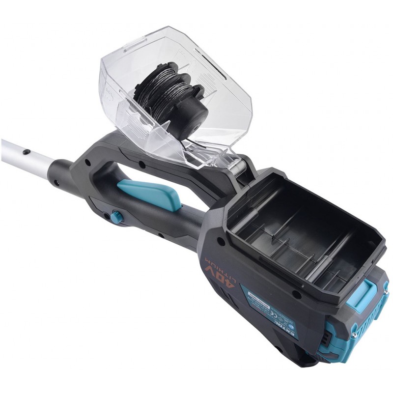 • pogumovaná rukojeť brání vysmeknutí, tlumí vibrace a zpříjemňuje držení při práci, je v ní také vložena náhradní cívka se strunou