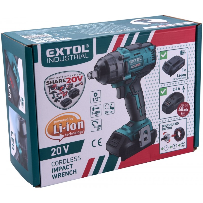 - Pre odoslanie na Slovensko navštívte EXTOL INDUSTRIAL uťahovák rázový 1/2 "aku SHARE20V,BRUSHLESS, 20V Li-ion, 2000mAh 8791810