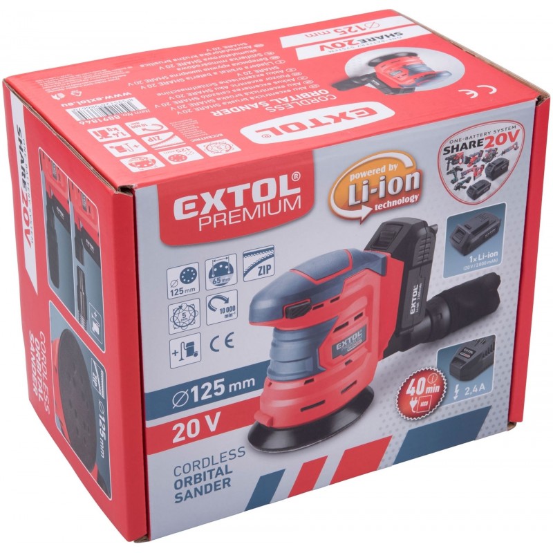 - Pre odoslanie na Slovensko navštívte EXTOL PREMIUM brúska excentrická aku SHARE20V, 125mm, 20V Li-ion, 2000mAh 8891846