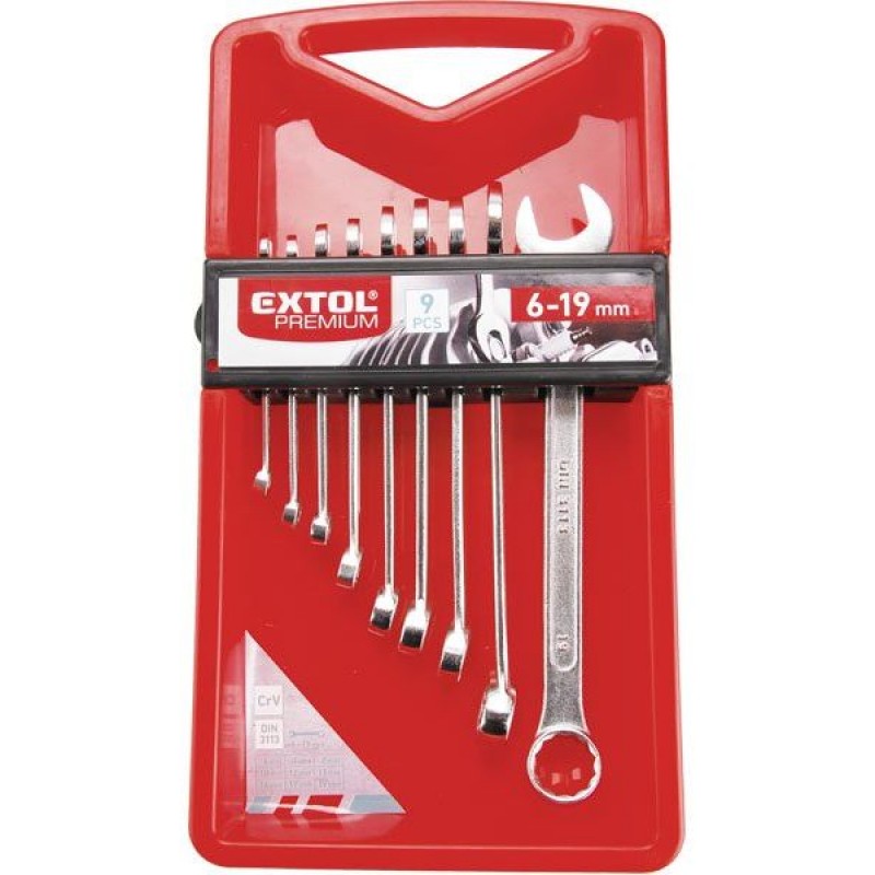 EXTOL PREMIUM klíče očkoploché, sada 9ks, 6-7-8-10-12-13-14-17-19mm, CrV 6352leštěná hlava klíčů, tělo kované z jednoho kusu z chrom-vanadové oceli, baleno v plastové kazetě s možností zavěšení na zeď