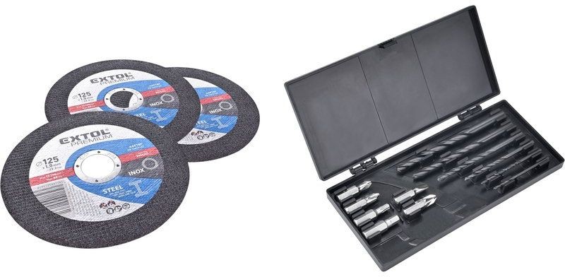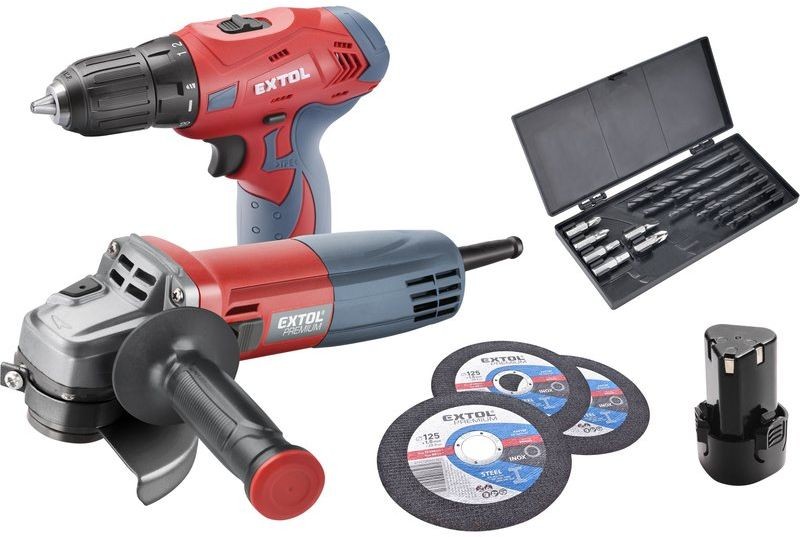 Akční sada obsahující nejpopulárnější elektrické nářadí pro práci - aku vrtací šroubovák a úhlovou brusku. Lehký a výkonný dvourychlostní vrtací šroubovák v ultra kompaktní velikosti je ideální pro středně těžké vrtání a šroubování do kovu a dřeva. Malá, praktická bruska určená pro lehké řezací a brusné práce, odbrušování svařovacích švů apod. Kompaktní rozměry umožňují pohodlnou práci jednou rukou. Celá sada je uložena v kvalitním boxu, který je kompatibilní s Extol Premium boxy. Součástí sady je také pouzdro s vrtáky a hroty a řezací kotouče.