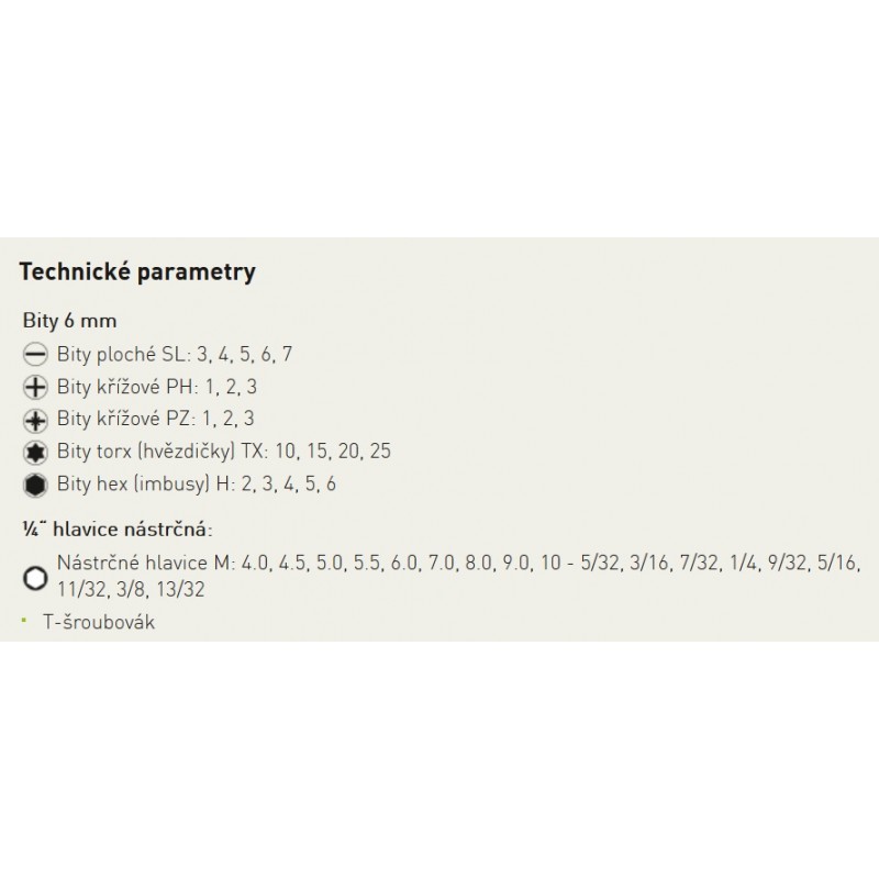 T-šroubovák na výměnné bity z CR-V materiálu, který představuje vyšší pevnost materiálu a zajišťuje tak menší opotřebení, užitečným pomocníkem při dotahování či povolování šroubů a vrutů s nutností vývinu větší síly. Kromě dvaceti základních bitů je sada vybavena osmnácti nástrčnými hlavicemi pro utahování a povolování matek. Sada obsahuje redukci a redukční kolénko, které slouží k prodloužení páky.