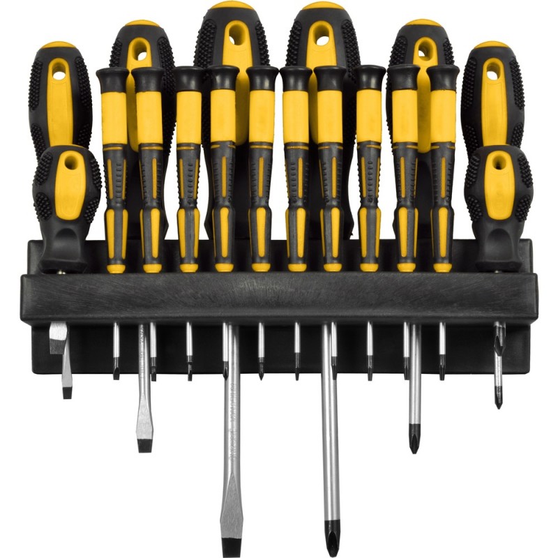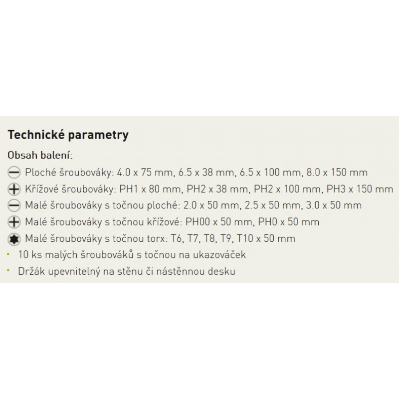 Sada šroubováků z CR-V materiálu, který představuje vyšší pevnost materiálu a zajišťuje tak menší opotřebení. Sada se skládá ze čtyř plochých, čtyř křížových šroubováků a deseti malých šroubováků s točnou na ukazováček. Rozměry šroubováků jsou vybrány tak, aby vyhovovaly vrutům použitým v každé domácnosti. Součástí sady je i nástěnný držák, který lze připevnit na zeď, stěnu či dvířka skříňky na nářadí.