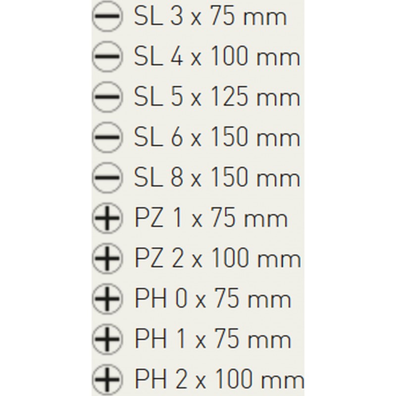 Sada šroubováků z CR-V materiálu, který představuje vyšší pevnost materiálu a zajišťuje tak menší opotřebení. Sada se skládá z pěti plochých a pěti křížových šroubováků. Rozměry šroubováků jsou vybrány tak, aby vyhovovaly vrutům použitým v každé domácnosti.