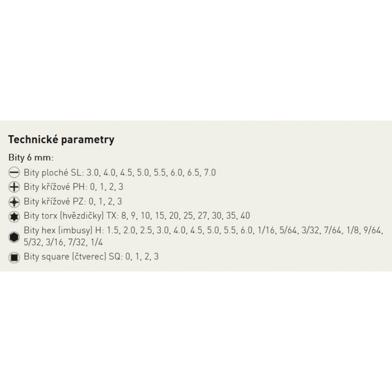• Bity hex (imbusy) H: 1.5, 2.0, 2.5, 3.0, 4.0, 4.5, 5.0, 5.5, 6.0, 1/16, 5/64, 3/32, 7/64, 1/8, 9/64, 5/32, 3/16, 7/32, 1/4