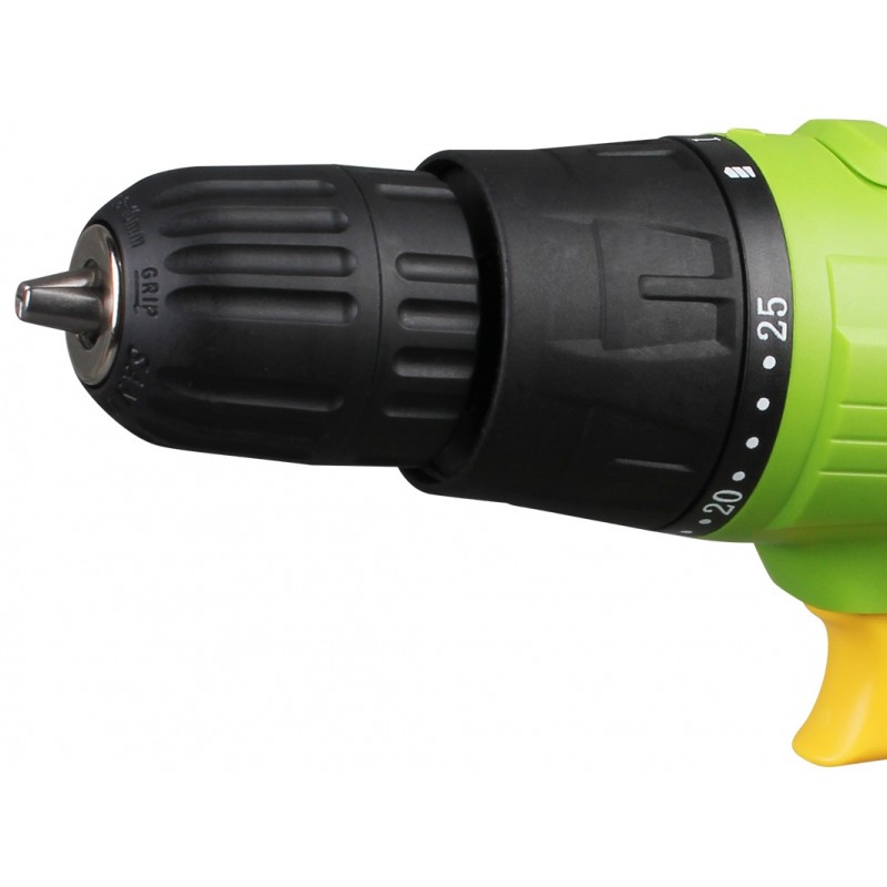 Vrtačka je i s baterií velmi lehká a vyvážená, navíc je vybavena pohodlnou ergonomickou rukojetí. Vrtačka má rychloupínací sklíčidlo do 10 mm, 2 rychlosti a 25+1 stupňů krouticích momentů, které jsou praktickým pomocníkem při šroubování a dotahování různých šroubů či vrutů.