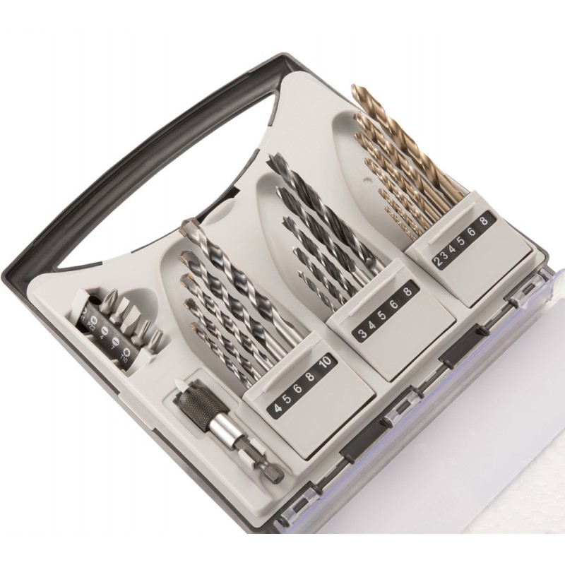 Sada vrtáků COBALT s bity vybavena šesti vrtáky do železa, pěti do dřeva a pěti do zdiva by neměla chybět u žádné vrtačky. S vrtáky do zdiva lze vrtat i pevnější materiály, jen je třeba vrtáky řádně chladit. Vylepšení sady zpočívá i v kobaltových vrtácích do železa, kterými lze vyvrtat mnohem větší počet děr než s běžnými vrtáky, vrtáky je vhodné rovněž chladit. Sada také obsahuje šest kusů bitů plochých a křížových, aby bylo například možné pohodlně připevnit konzolku nad okno. Nástrčná hlavice s točnou slouží k přesnějšímu šroubování.