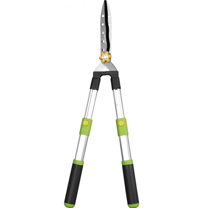 Teleskopické nůžky na živý plot dokáží ustříhnout větve hravě do 5 mm. Komfortu stříhání velmi pomáhá délka nůžek 620 až 820 mm a také rukojetím ze slitiny hliníku. Ergonomické úchyty s pogumovaným povrchem zaručí neskluznost i námahou vlhčích dlaní.
