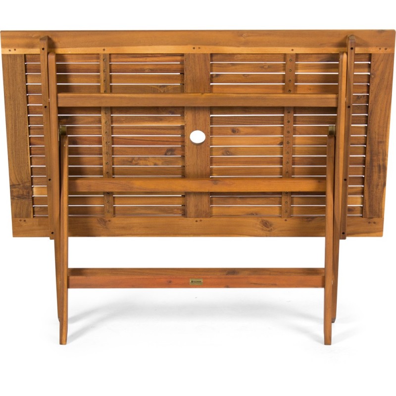 Sestava zahradního nábytku složená z obdélníkového stolu a čtyř židlí. Kvalitní a ergonomicky tvarované židle mají rozměr 49 x 57x 94 cm a je možné je složit. Obdélníkový stůl o rozměru 120 x 70 x 75 cm je opatřen otvorem pro umístění slunečníku a leze také velice snadno složit. Na sedáky židlí je možné dokoupit voděodolné polštáře krémové a zelené barvy. Celá sestava je vyrobena z kvalitního dřeva tropické Akácie