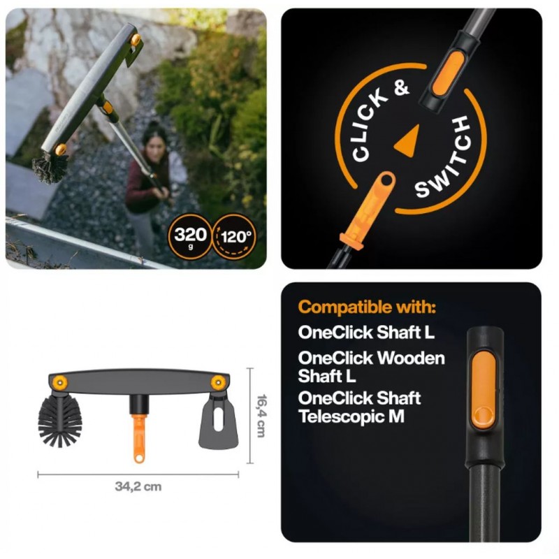 FISKARS Čistič okapů OneClick je praktický a bezpečný kutilský nástroj určený pro efektivní údržbu střešních žlabů přímo ze země. Kombinuje škrabku pro odstranění hrubých nečistot a zaoblený kartáč pro finální dočištění. Nastavitelný úhel pracovní hlavy a teleskopická násada FISKARS OneClick umožňuje rychlou a ergonomickou práci bez použití žebříku.
