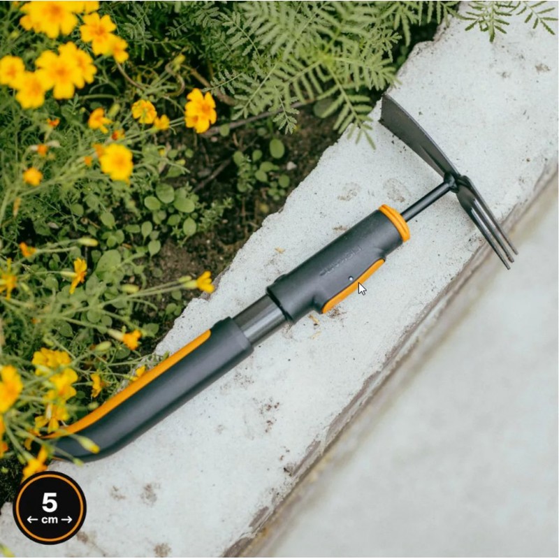 FISKARS OneClick Motyčka dvoustranná je všestranný zahradní nástroj navržený pro kypření půdy i pletí plevele bez nutnosti výměny nářadí. Kombinace ploché čepele pro přesné odříznutí plevele a dvojhrotu pro provzdušnění zhutnělé zeminy umožňuje efektivní práci i v úzkých řádcích mezi rostlinami.