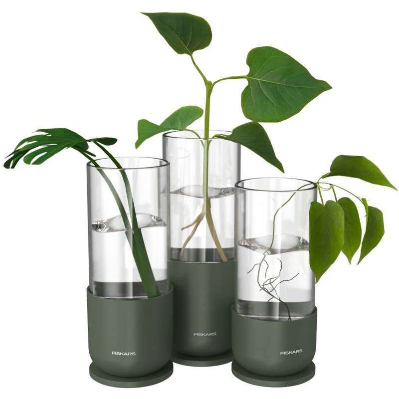 FISKARS sada na množení rostlin vám umožní zakořenit nové rostliny stylově a efektivně. Tato třídílná sada je navržena tak, aby proměnila řízky vašich oblíbených rostlin v nové, zdravé sazenice. Kombinace prémiového skla a stabilní kovové základny tvoří nejen funkční nástroj pro pěstitele, ale i elegantní doplněk do interiéru.