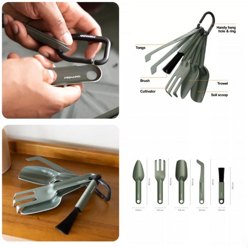 FISKARS sada nářadí na kultivaci obsahuje pět odolných nástrojů z kvalitní nerezové oceli. Je ideální pro přesazování rostlin v květináčích a péči o rostliny na balkonech, terasách i parapetech, včetně kaktusů a rostlin s trny.