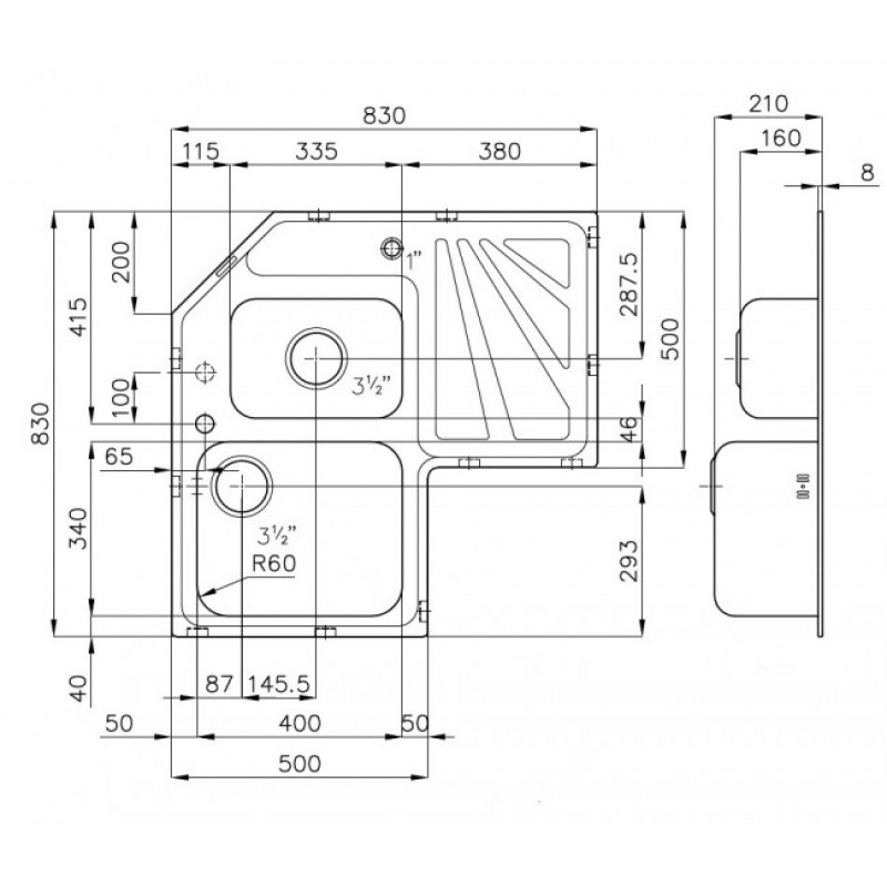 FOSTER nerezový dřez rohový, STD 3308- rozměr: 830x830 mm