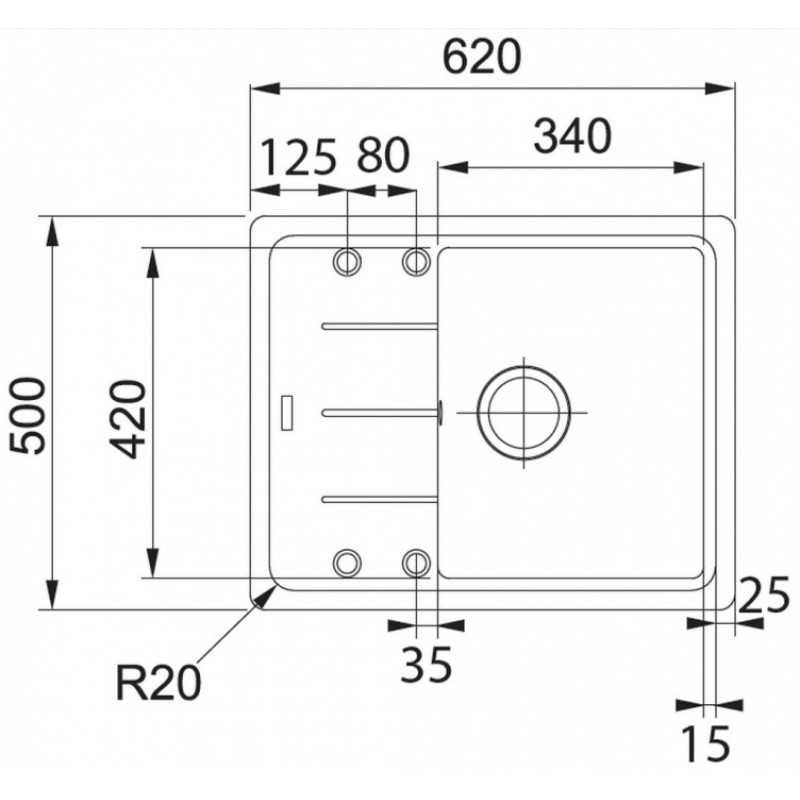 Franke Basis BFG 611-62, Fragranitový dřez, onyx 114.0285.105/ OTVOR - JIŽ S VYVRTANÝM OTVOREM NA BATERII - ODKAP VLEVO - VANIČKA VPRAVO.Rozměry: 620 × 500 mm