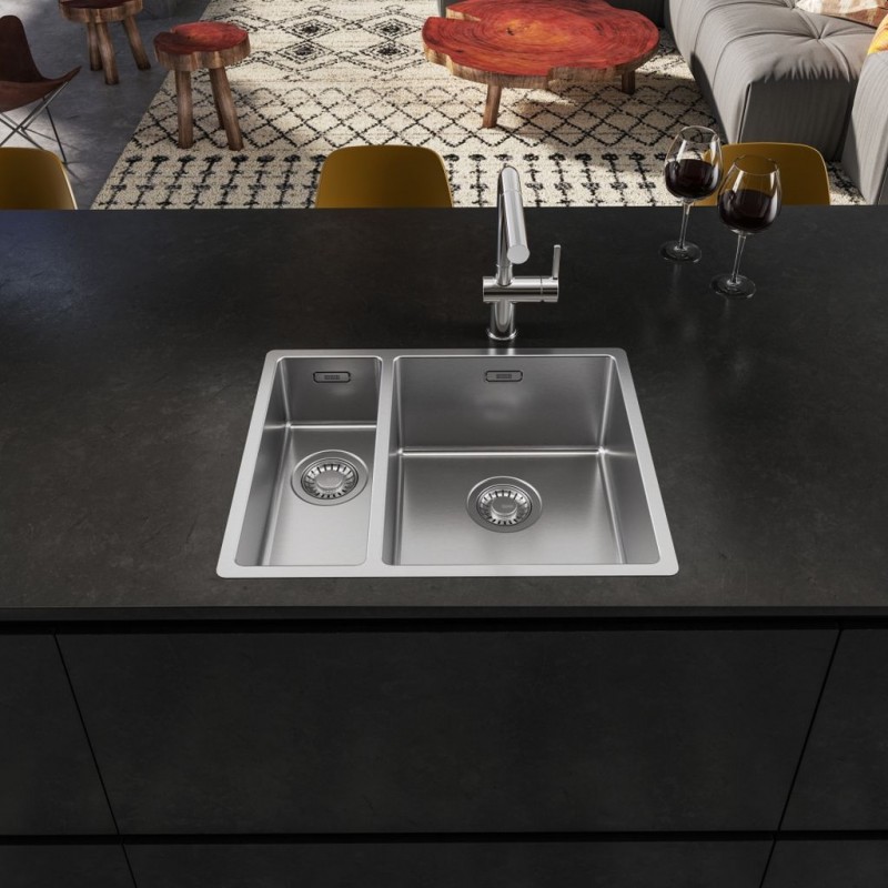 Nerezový dřez Box. Cena zahrnuje: 2× Sítkový ventil 3 1/2" s přepadem. Sifon pro úsporu místa 6/4" s odbočkou na myčku nádobí. Dřez pro horní montáž s plochým okrajem, do roviny a pro spodní montáž. Fixační příchytky Fast-Fix.