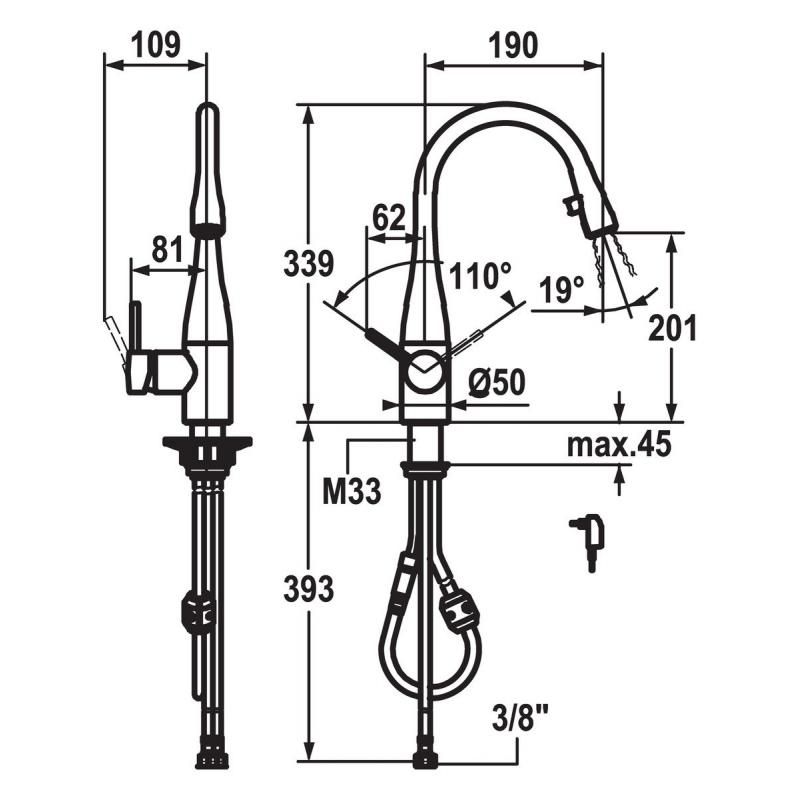 Stojánková tlaková baterie Franke KWC Eve v klasickém chromovém provedení. Baterie je osazena vytahovací koncovkou se sprchou a je otočná o 270°. LED osvětlení , které se samo po 45 minutách vypne.Technické údaje: