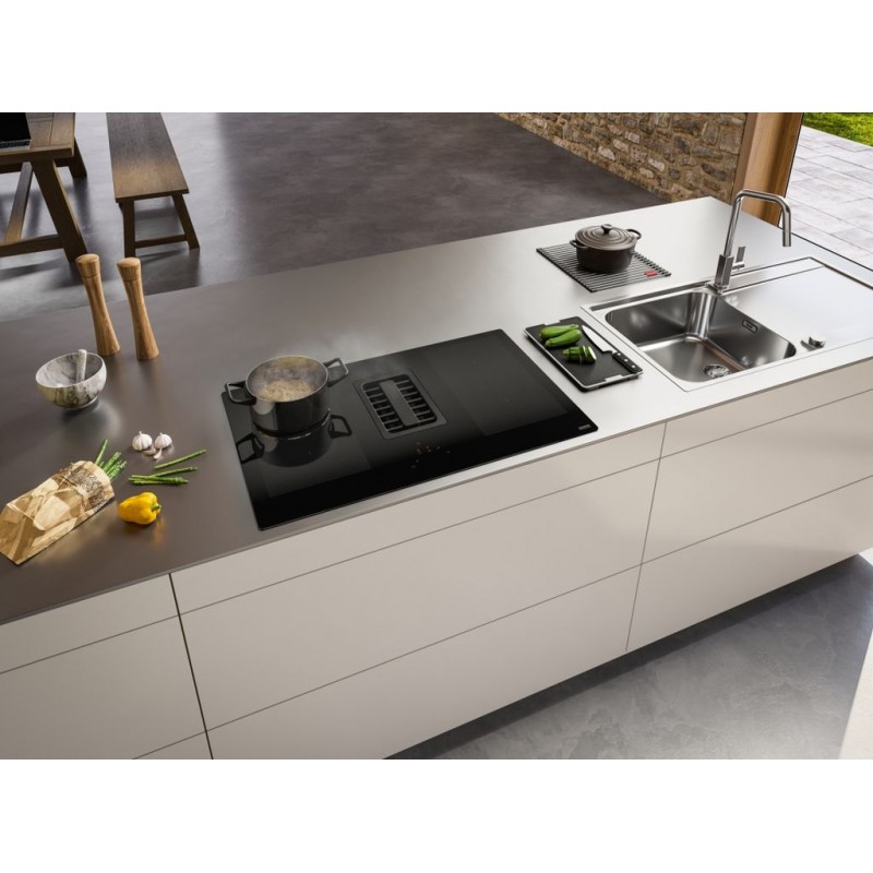 Odsavač par v indukční varné desce z řady Maris. Provedení černé sklo. Energetická třída A++. Odsavač par: Montáž do pracovní desky. Šířka 83 cm. Ovládání: Senzorové. Digitální červený displej + Dotykový ovladač typu Slide. 8 Stupňů výkonu. 2× Intenzivní stupeň. Doběh. Automatická aktivace s varnou deskou. Voděodolný motor. Litinová mřížka. Max. výkon 700 m3/h (Norma EN 61591). Součástí odsavače par je vyjímatelný kolektor na tekutinu (V případě náhodné vylití tekutiny do odsavače par). Indukční varná deska: 4 Varné zóny. 2× Flexi zóna. Ovládání: Digitální červený displej + Dotykový ovladač typu Slide. 9 Úrovní ohřevu. Funkce: Rozpouštění. Booster. Stop&Go. Dětský zámek. Časovač 4×. Odsavač par i indukce jsou perfektně integrovány. Odsávání je aktivováno automaticky, jakmile je varná deska v provozu.