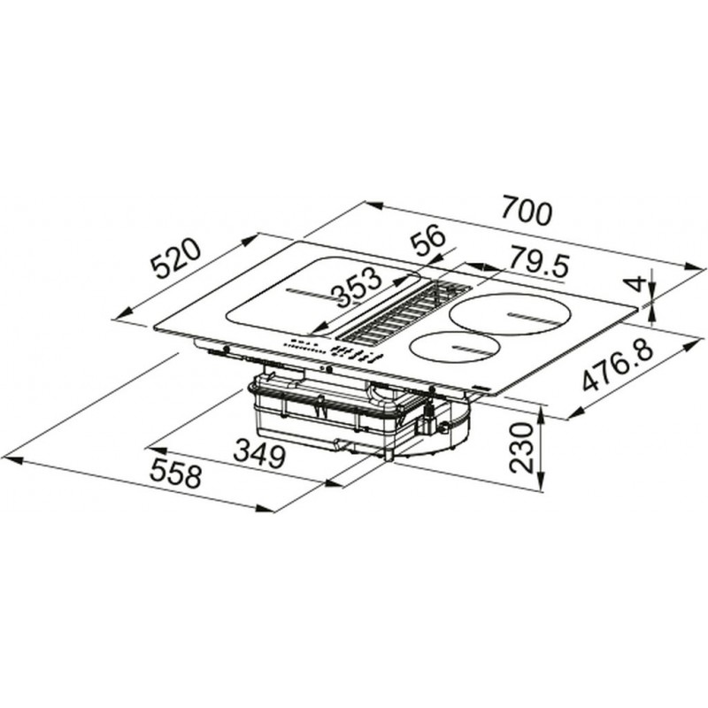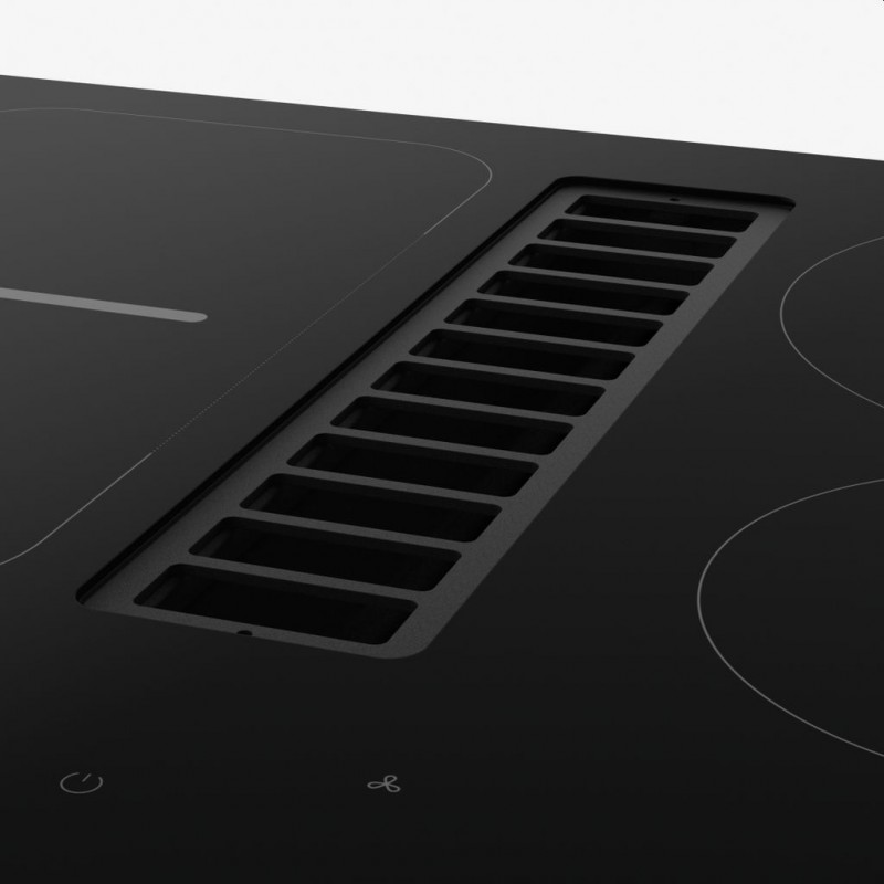 Odsavač par v indukční varné desce z řady Smart. Provedení černé sklo. Energetická třída A++. Odsavač par: Montáž do pracovní desky. Šířka 83 cm. Ovládání: Senzorové. Digitální červený displej + Dotykový ovladač typu Slide. 9 Stupňů výkonu. 1× Intenzivní stupeň. Doběh. Automatická aktivace s varnou deskou. Voděodolný motor. Litinová mřížka. Max. výkon 630 m3/h (Norma EN 61591). Součástí odsavače par je vyjímatelný kolektor na tekutinu (V případě náhodné vylití tekutiny do odsavače par). Indukční varná deska: 4 Varné zóny. 1× Flexi zóna. Ovládání: Digitální červený displej + Dotykový ovladač typu Slide. 9 Úrovní ohřevu. Funkce: Rozpouštění. Booster. Stop&Go. Dětský zámek. Časovač 3×. Odsavač par i indukce jsou perfektně integrovány. Odsávání je aktivováno automaticky, jakmile je varná deska v provozu.
