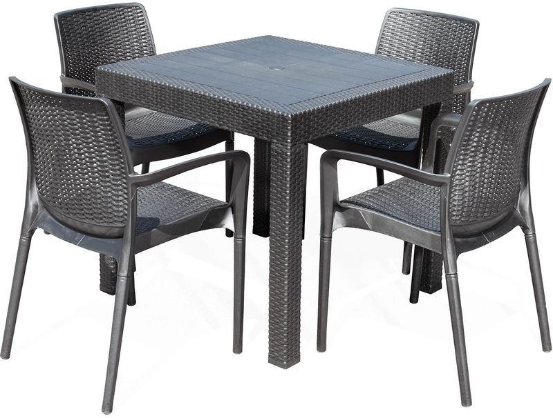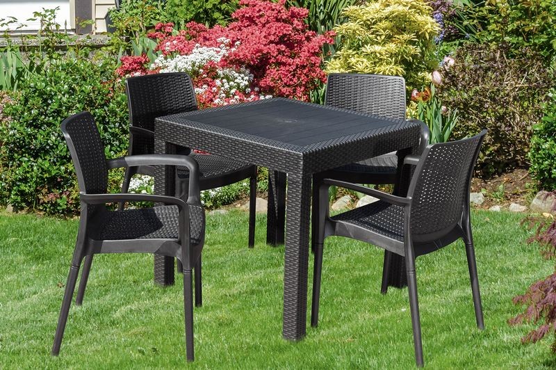 Dopřejte si pohodlí i venku, zasloužíte si to! Souprava se skládá z bytelného stolu a 4 židlí s opěradly. Nábytek je vyrobený z plastu s imitací ratanové struktury. Materiál je výjimečně odolný vůči povětrnostním vlivům, proto nemusíte nábytek uklízet při každé dešťové přeháňce. Nedělejte si starosti ani s údržbou, jednoduše otřete nábytek vlhkým hadrem a je jako nový.