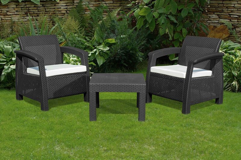 Souprava je vyrobena z lisovaného plastu v imitaci plochého ratanu. Materiál je výjimečně odolný vůči povětrnostním vlivům, proto nemusíte nábytek uklízet při každé dešťové přeháňce. Nedělejte si starosti ani s údržbou, jednoduše otřete nábytek vlhkým hadrem a je jako nový.