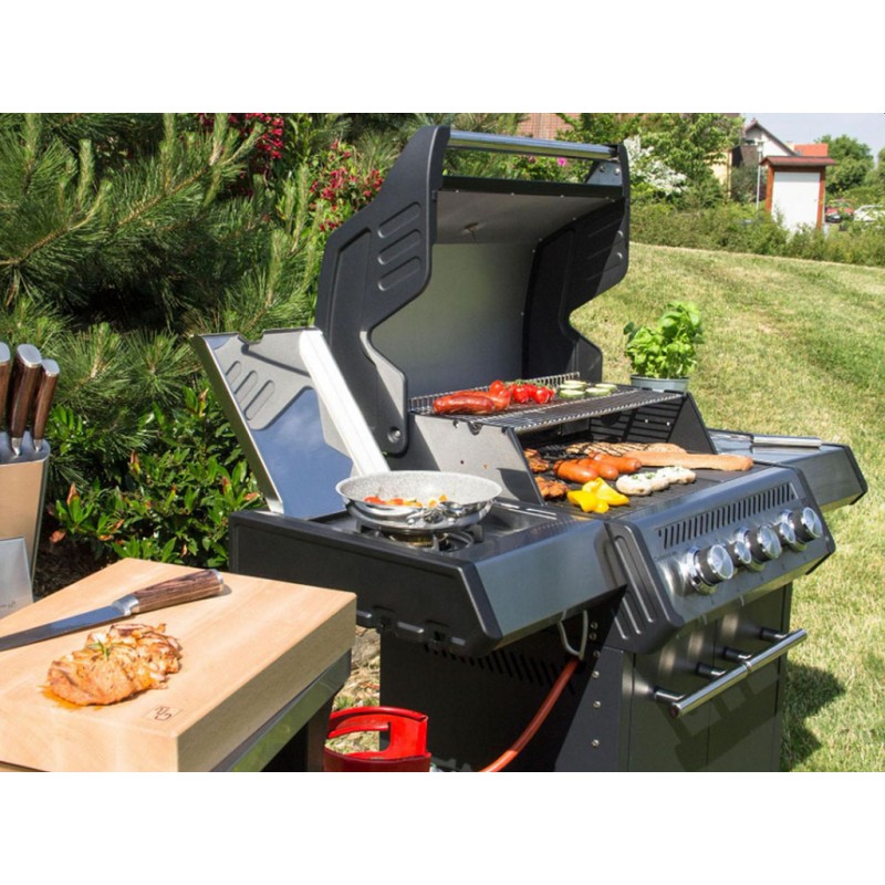 Umístění hořáku zaručuje zdravou úpravu pokrmů a na hořáku se nepřipaluje ani tuk nebo šťávy. Teplo totiž proudí horizontálně a na hořák nekape omastek z pečení. Můžete na něm ugrilovat vynikající steak nebo celé kuře. Je výborný i pro grilování na grilovací jehle (dokoupitelné příslušenství). Pokud se chystáte na delší grilování, například kuřat vcelku, využijete jej naplno a stane se nepostradatelným. Výborný je i na minutky nebo steaky.