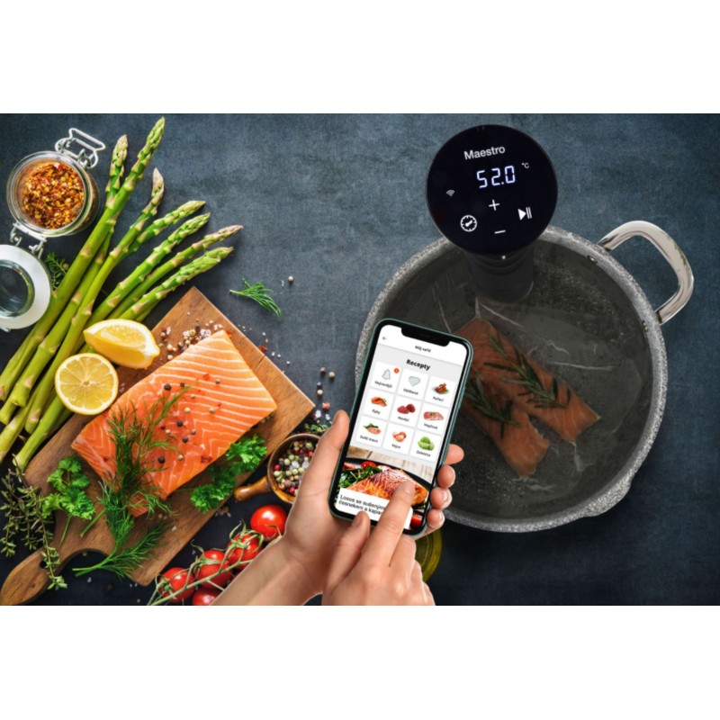 Příklad: Vložíte do hrnce s vodou zavakuované suroviny a odejdete do práce nebo na výlet. Cestou si na mobilu zvolíte recept a pošlete přes apku pokyn do sous-vide G21 Maestro. Po návratu můžete prostírat.