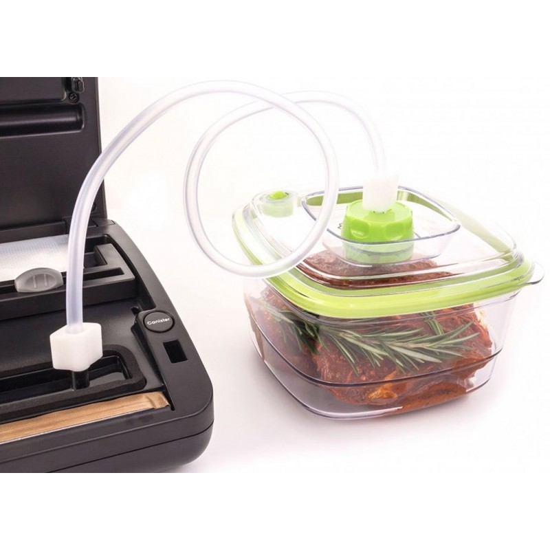 Vakuovačka G21 Nefrit odsává vzduch nejen z vakuovacích sáčků nebo fólií v rolkách, ale i z vakuovacích marinovacích dóz. Stačí napojit hadičku na příslušný otvor vakuovací dózy G21 (hadička je součástí balení dózy) o objemu 1,4 nebo 2 l, zmáčknout příslušné ovládací tlačítko a potraviny v dóze budou spolehlivě zavakuované.
