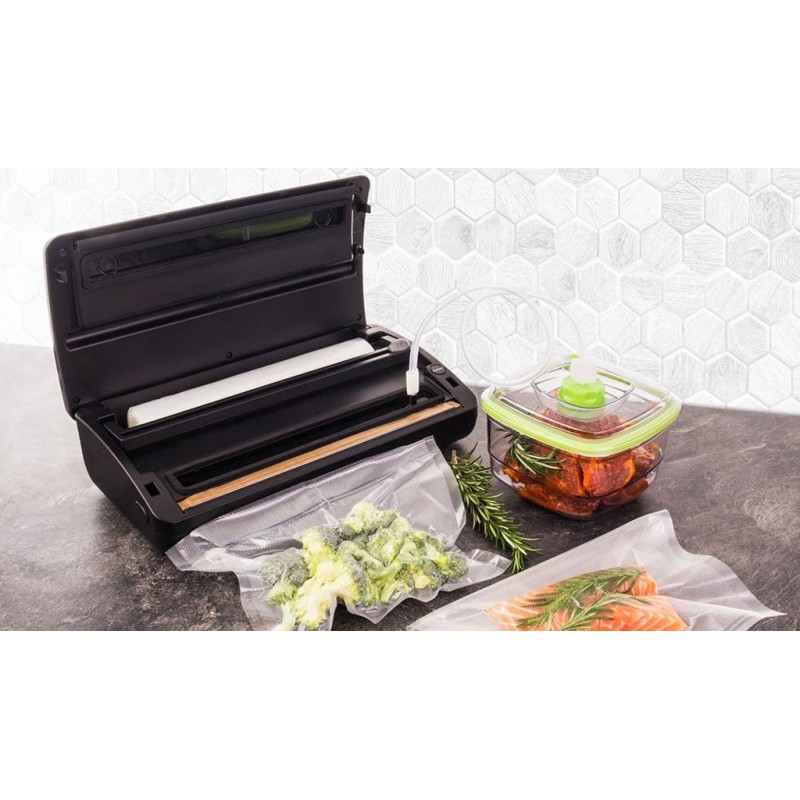 Vakuovačka G21 Nefrit se zabudovaným zásobníkem fólie a řezačkou si už po prvním použití získá vaši oblibu. Pracuje na profesionální úrovni, je velice výkonná a spolehlivá. Duální pumpa zajistí dokonalé odsátí vzduchu a speciální dvojité sváry obal na zavakuované surovině spolehlivě utěsní. Maso nebo další suroviny, připravené pro vaření metodou sous-vide, jsou tak ve vakuu chráněny před působením vzduchu a výsledek bude chuťově dokonalý, voňavý, bez ztráty přirozených šťáv, chutí nebo barev.