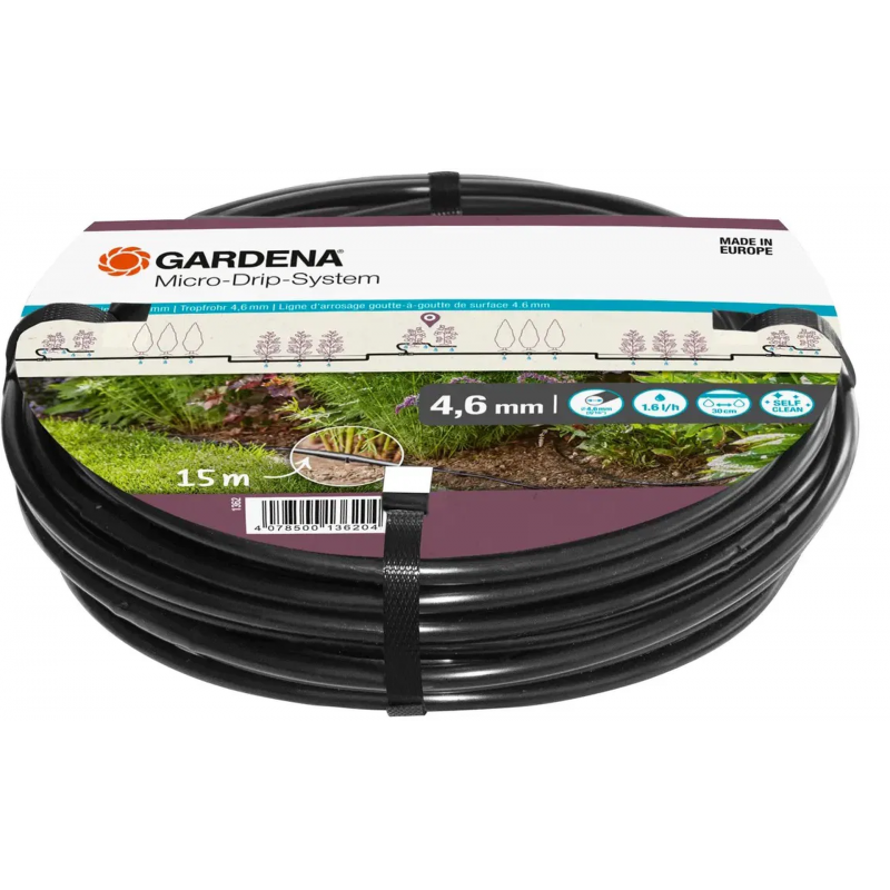 15 m dlouhá kapací hadice 4,6 mm (3/16") GARDENA zajišťuje spolehlivé, přesné a vodu šetřící kapkové zavlažování keřů, květinových záhonů i citlivých plodin. Ideálně se hodí pro použití se sadou GARDENA Micro-Drip na zavlažování zeleniny a rostlin v řádcích (č. v. 13010-20). Instalace je rychlá – hadici jednoduše rozvinete ke rostlinám a upevníte pomocí držáků potrubí (č. v. 13218-20).