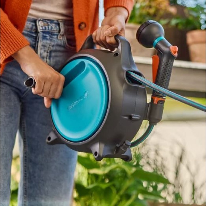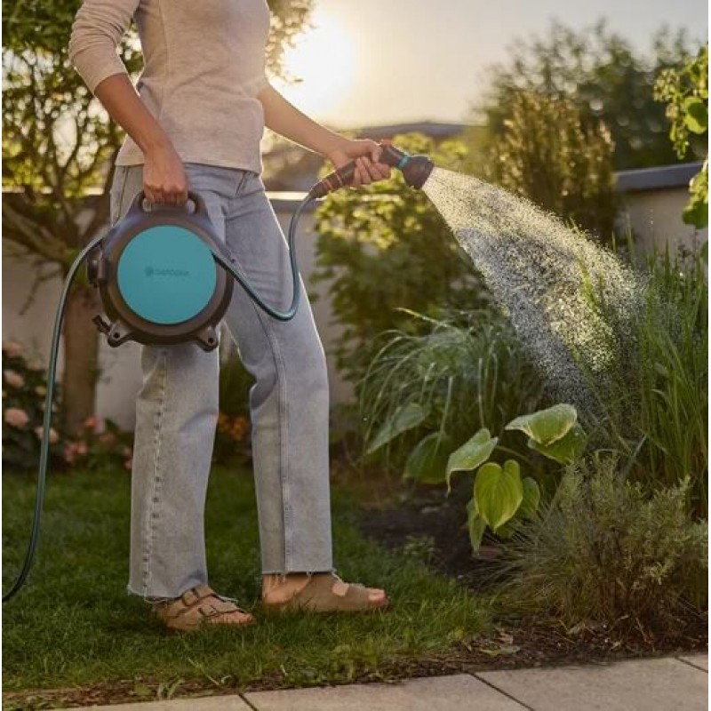 Skládací klika zajišťuje rychlé a pohodlné navinutí hadice po zalévání, zatímco kompaktní provedení umožňuje úsporné skladování i v omezeném prostoru.