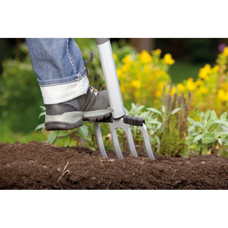 GARDENA rycí vidle Terraline, rukojeť T 3781-20GARDENA rycí vidle Terraline ™ jsou cenným pomocníkem při výsadbě a rytí, které šetří kořeny, při kopání a kypření půdy. Extra široká a ergonomicky tvarovaná rukojeť ve tvaru T s prvky z měkčeného plastu je velmi pohodlná pro držení oběma rukama. Sázení a okopávání rostlin je mnohem snazší. Extra velké stupátka se širokým okrajem umožňují dobré působení síly a snižují riziko zranění při neúmyslném sklouznutí. Dalším plusem rycích vidlí Terraline ™ je tlumič Softec ™, který je velmi šetrný ke kloubům a byl přihlášen k patentování. Zpětný náraz při rytí je redukován, např. když narazíte na kámen nebo na silné kořeny. Tvar rukojeti je také ideální: profil rukojeti ve tvaru kapky zajišťuje, že se rukojeť dobře drží a zabraňuje nežádoucímu sklouzávání. Izolační plastová objímka chrání před chladem a umožňuje příjemnou, neklouzavou manipulaci. Čtyři pevné špičaté hroty jsou z kalené oceli s vysoce kvalitní povrchovou úpravou. Celková délka rycích vidlí je 117 cm.