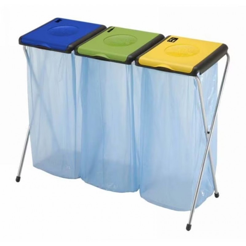 Stojan na odpadkové pytle v praktickém a univerzálním designu. Obsahuje symboly třídění odpadu. Stojan na třídění odpadu je vhodný pro všechny druhy pytlů s kapacitou do 130 l. Tento stojan na odpadkové pytle pro třídění odpadu je odolný slunečnímu záření. Dvojitý okraj na lepší zajištění pytle proti nechtěnému vyklouznutí a vysypání obsahu. Protiskluzové nožičky. Zákazníkům se bude posílat barevná varianta, která je na obrázku: žlutá-zelená-modrá.
