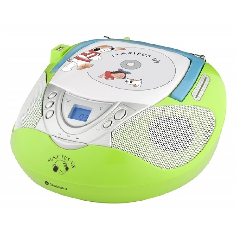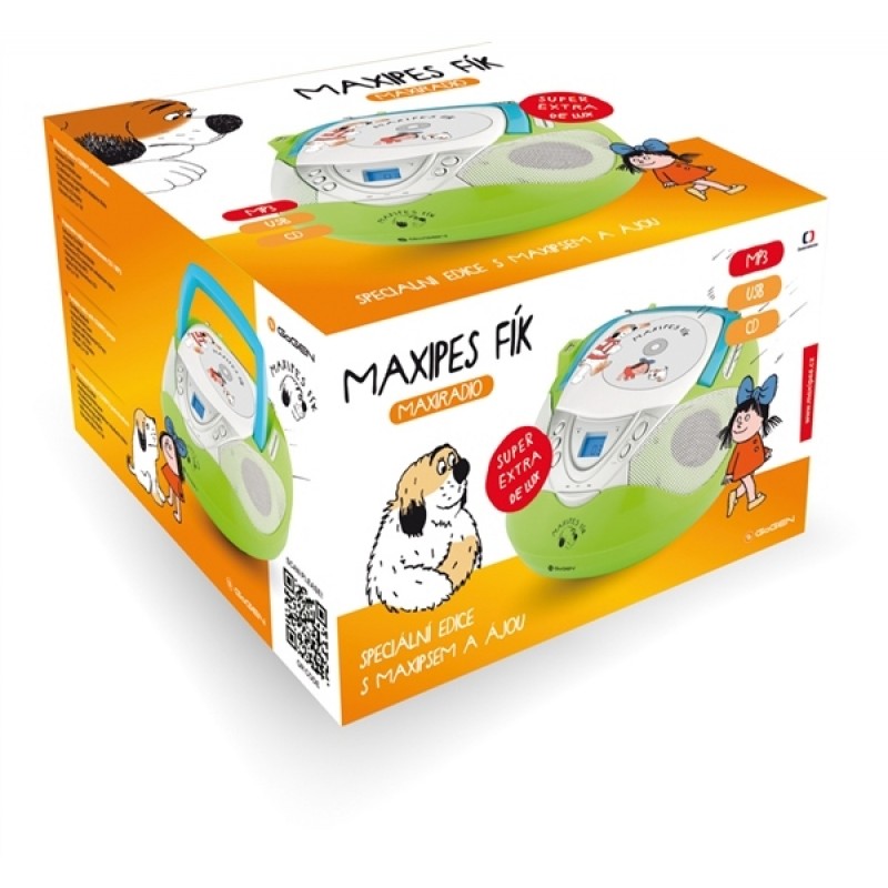 Do veselého designu s obrázky Maxipsa Fíka jsme zabalili CD přehrávač, který zvládá samozřejmě formáty CD-R/RW, dále analogový FM/AM tuner pro poslech rádia a to vše doplnili USB vstupem pro připojení Flash pamětí nebo externích pevných disků na přehrávání skladeb ve formátu mp3.