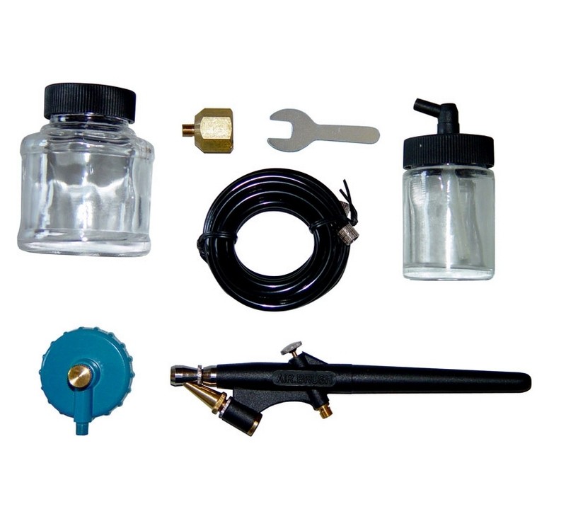 Obsah sady: stříkací pistole, tryska O 0,5 mm, 2m vzduchová hadice s přípojkami, dvě skleněné nádobky s víčkem (22/60 cm3 ), víčko s regulačním ventilem, montážní klíč.