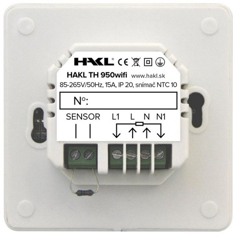Termostat HAKL TH 950 wifi pripojený k internetové síti poskytuje inteligentní smart rešení vaší domácnosti. Pomocí aplikace v mobilním zarízení mužete termostat ovládat z jakéhokoliv místa na svete pokrytým datovým signálem.Termostat s vestaveným snímacem, prodlouženým podlahovým cidlem, s programovatelným casovacem a dotykovým ovládáním. Pri týdenním cyklu je možné nastavit ctyri casové úseky na každý den s ruznou teplotou. Termostat je primárne urcen pro ovládání dvou teplot, kde jedna je primární a druhá limitovaná. Muže rídit podlahové