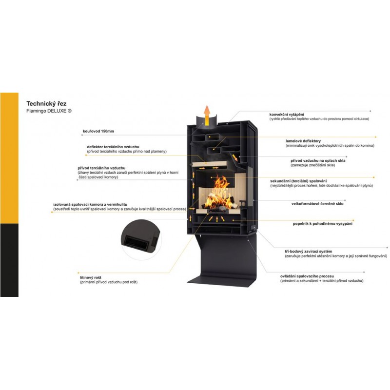Systém spalování u kamen Flamingo DELUXE je dokonalost sama. Přísun vzduchu je zajištěn centrálně ze zadní části kamen. Množství popela je minimální. Celý spalovací proces je ovládán dvěma táhly, kdy první slouží k regulaci primárního vzduchu, potřebného k zatopení a rozhoření dřeva. Druhé táhlo slouží k podpoře sekundárního spalování, tedy spalování plynů. Jeho otevřením dochází k přísunu terciálního předehřátého vzduchu do horní části, který je vháněn do komory pomocí vrchního deflektoru. Tento vzduch se používá k úspornému a co nejefektivnějšímu průběhu hoření dřeva. Tímto je zajištěna vysoká účinnost a krásné hoření včetně čistého skla. K zajištění správného spalování je zapotřebí správný tah komína, který docílíte umístěním regulátoru.