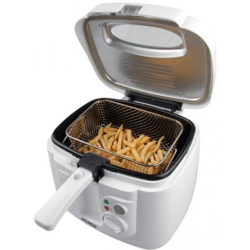 Fritovací hrnec Hyundai DF 203 nabízí objem 2,5 litru oleje v nádobě s nepřilnavým povrchem. Proces přípravy jídel lze sledovat průhledovým okénkem ve víku.