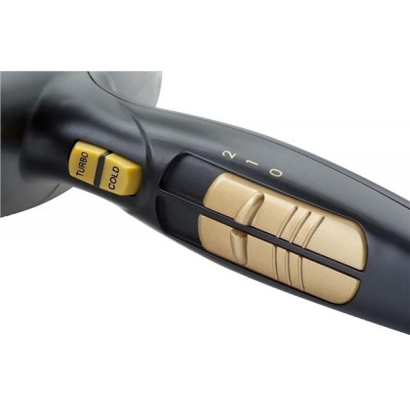 Stylový vysoušeč vlasů černo-zlaté barvy s vysokým příkonem 2200 W vám pomůže vykouzlit účes vašich snů.
