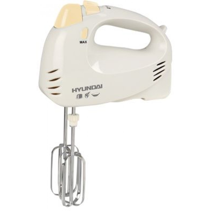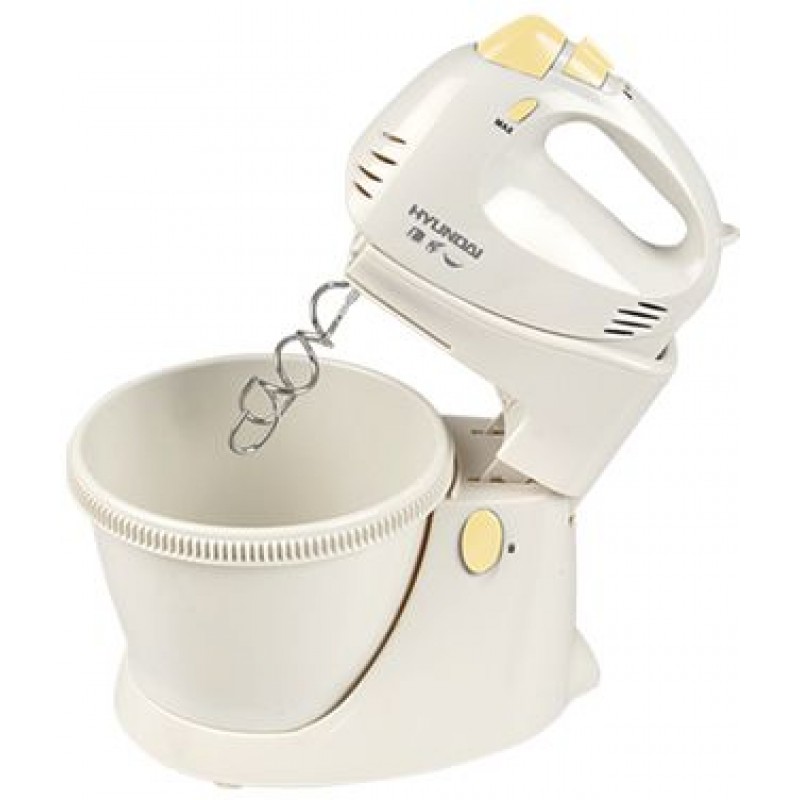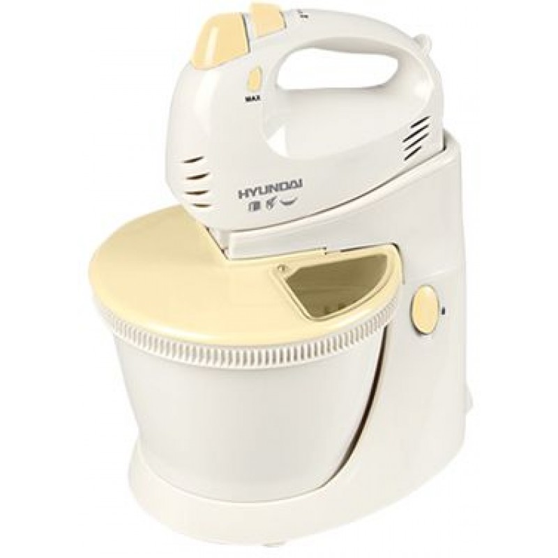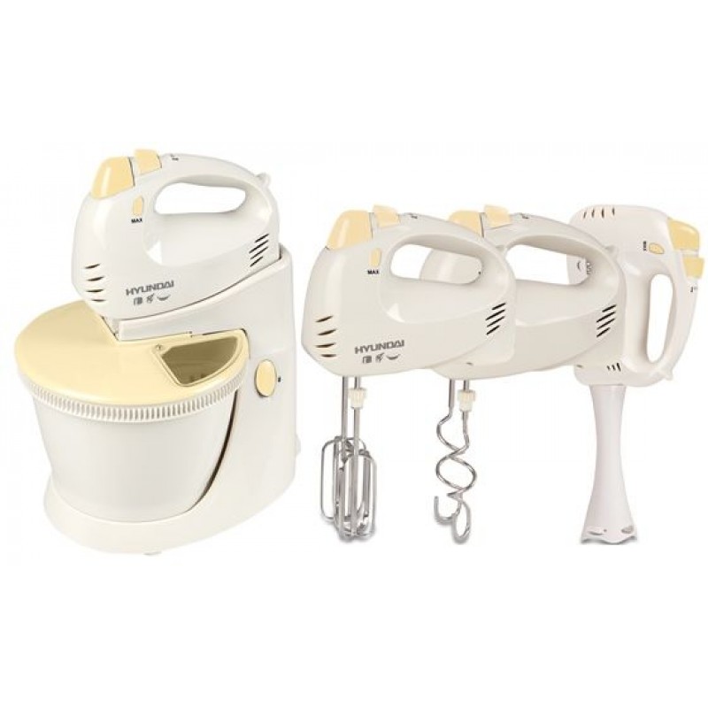 Ruční šlehač Hyundai HMB 205W s mísou o objemu 3 l a víkem s plnícím otvorem pro jednoduché doplňování surovin. Šlehač má také pohon pro otáčení mísy. Přístroj lze použít také jako ponorný mixér a má v balení dvě šlehací a dvě hnětací metly. Rychlost lze nastavit v pěti stupních s Turbo stupněm navíc. Na těle najdete tlačítko pro uvolňování nástavců a příkon přístroje činí 300 W.