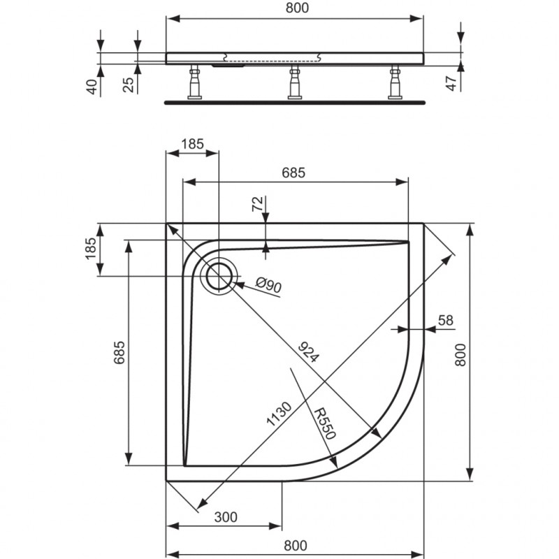 Ultra Flat čtvrtkruhová sprchová vanička ze sanitárního akrylátu. Vyrobeno podle DIN 14527. Vnější plášť vyztužen skelným vláknem. Zpevněný rám a dno vaničky. Odpad průměr 90 mm. Radius 550 mm. Montáž - nohy ke sprchové vaničce a MEPA set.